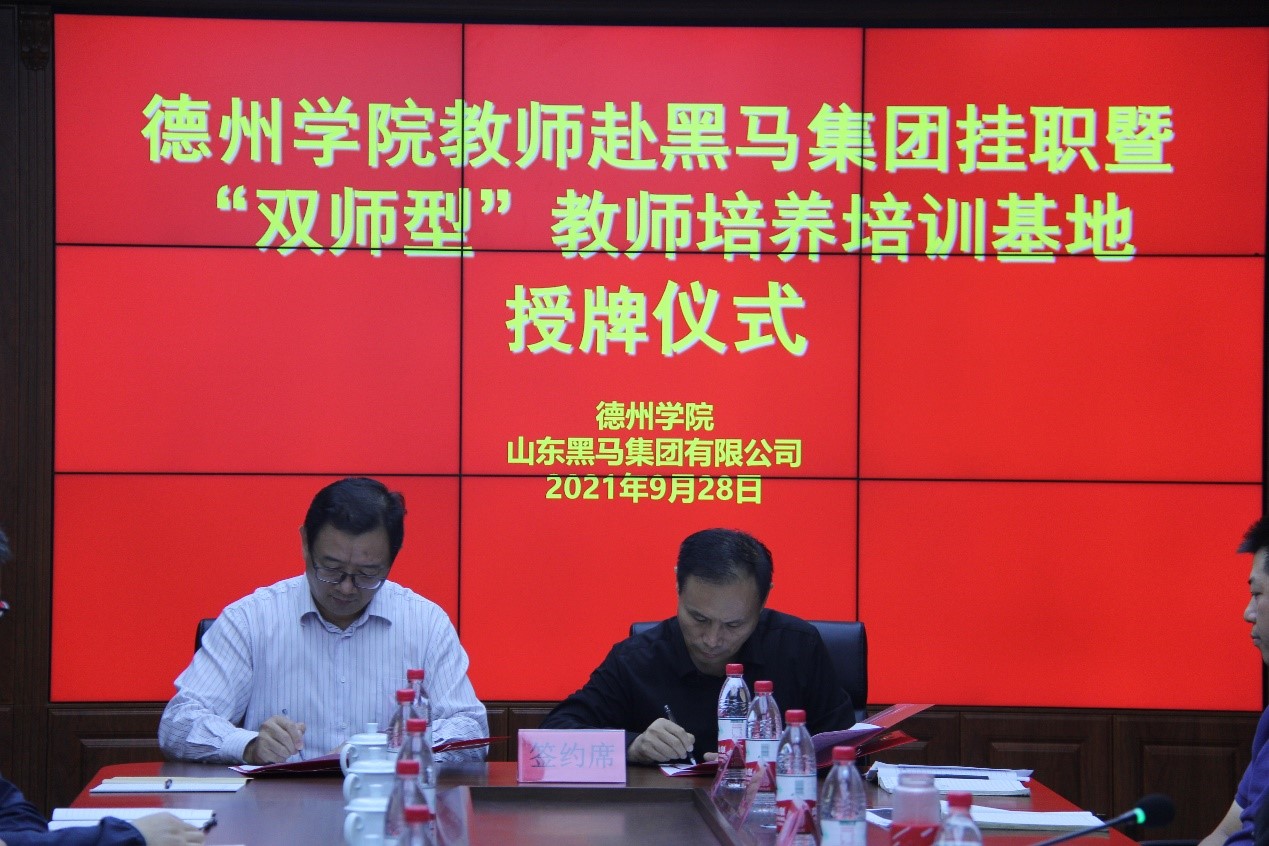 为了推动我校应用型大学建设,扎实开展“一学院一中心一基地”合作,搭建师生服务地方的平台,促进双师型师资培养,2021年9月28日下午,我校与山东黑马集团在黑马集团总部三楼会议室联合举行教师挂职暨“双师型”教师培养培训基地授牌仪式。我校党委委员、副校长李永平,山东黑马集团执行董事长、总裁刘辉东出席仪式。