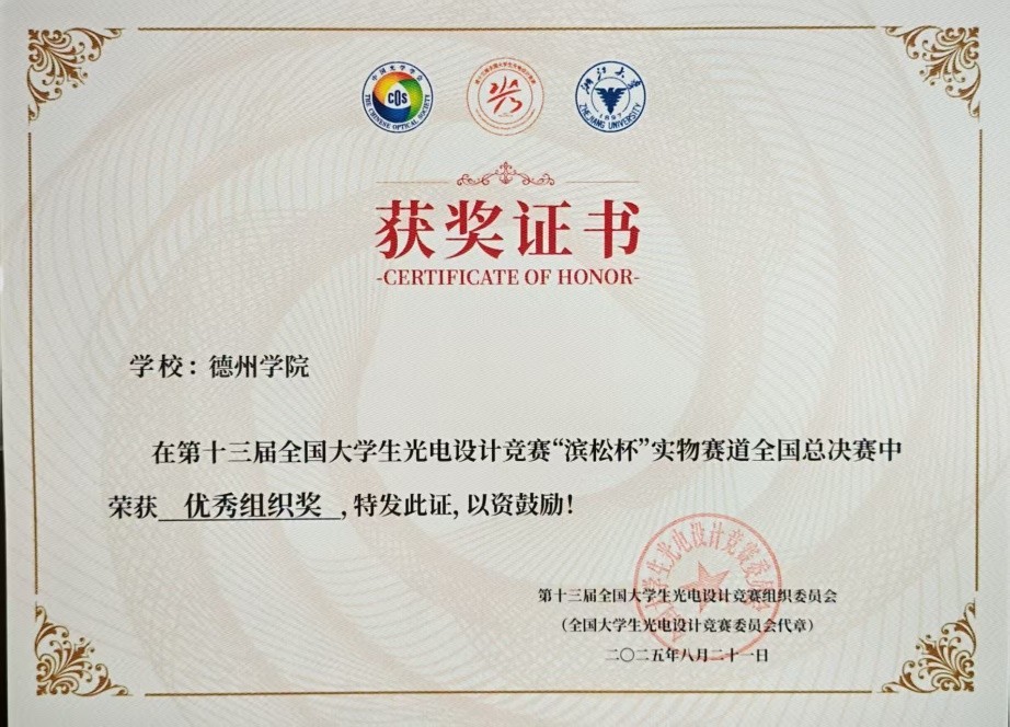 近日,2025年第十三届全国大学生光电设计竞赛“滨松杯”实物赛道全国总决赛在浙江大学举行,我校选派的参赛团队作为山东省唯一入围决赛的队伍,凭借出色表现获得全国总决赛一等奖的优异成绩。同时,我校获得优秀组织奖。