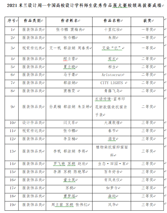 为培养更多设计服务领域的应用型、复合型人才,增强大学生的趋势设计意识,促进设计学科发展,以赛促教、以赛促改、以赛促学,不断提高自主创新能力和产品国际竞争力等方面贡献力量。经校赛专家评委评审,现将“2021年米兰设计周-中国高校设计学科师生优秀作品展大赛”校级选拔赛成绩公布如下: